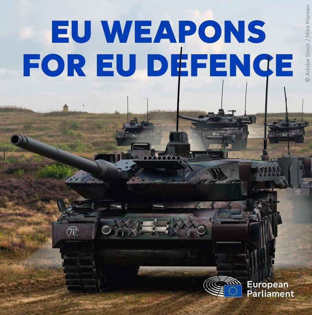 Άρματα μάχης σε σχηματισμό, με το σύνθημα «EU weapons for EU defence» και το λογότυπο του Ευρωπαϊκού Κοινοβουλίου.