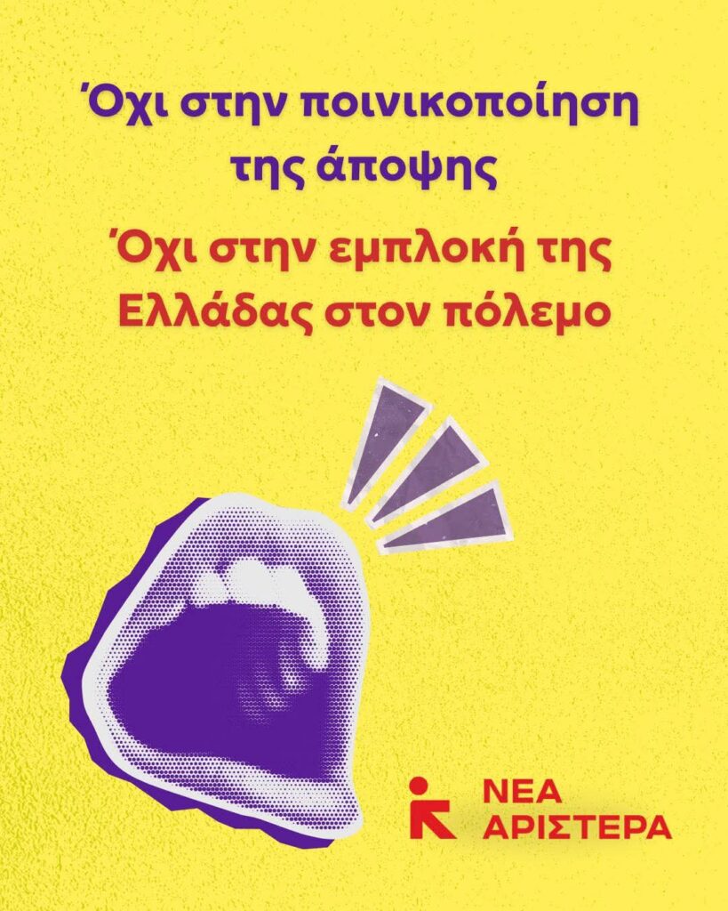 Ανακοίνωση Νέας Αριστεράς: Όχι στην ποινικοποίηση της άποψης και την εμπλοκή της Ελλάδας στον πόλεμο