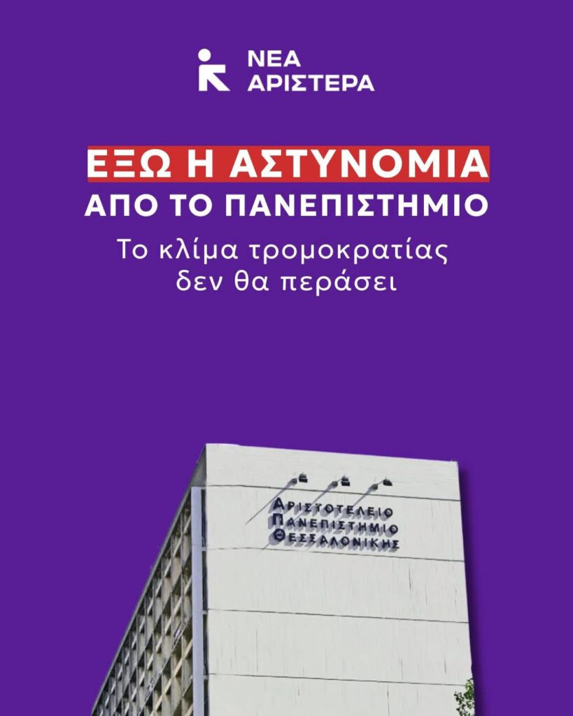 Η κυβέρνηση από κοινού με τις Πρυτανικές Αρχές του Αριστοτέλειου Πανεπιστήμιου Θεσσαλονίκης μετατρέπουν τον πανεπιστημιακό χώρο σε μια αποστειρωμένη επιχειρηματική μονάδα εφαρμόζοντας σχέδιο καταστολής και τρομοκρατίας.