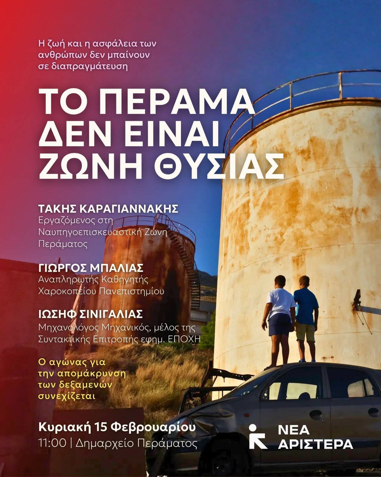 Το Πέραμα ζει στη σκιά ενός μόνιμου κινδύνου. Οι δεξαμενές καυσίμων βρίσκονται δίπλα σε σπίτια, σχολεία και χώρους καθημερινής ζωής. Τα επαναλαμβανόμενα ατυχήματα και η επιστημονικά τεκμηριωμένη επιβάρυνση της υγείας των κατοίκων από την παρουσία τους εξάντλησαν την ανοχή μας.