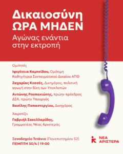 Εκδήλωση Νέας Αριστεράς: Δικαιοσύνη ΩΡΑ ΜΗΔΕΝ – Αγώνας ενάντια στην εκτροπή