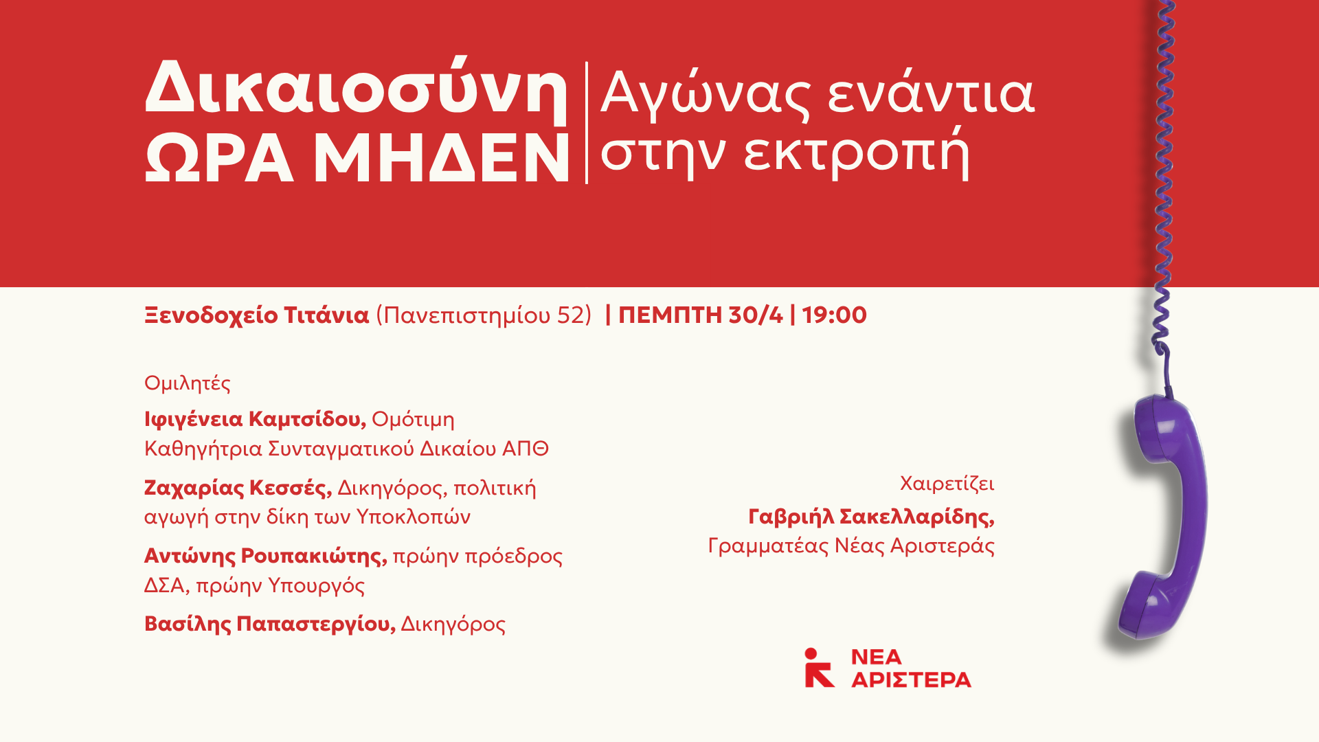 Η Νέα Αριστερά διοργανώνει εκδήλωση με θέμα «Δικαιοσύνη ΩΡΑ ΜΗΔΕΝ – Αγώνας ενάντια στην εκτροπή», με επίκεντρο το σκάνδαλο των υποκλοπών και τις επιπτώσεις του στο κράτος δικαίου και τη δημοκρατία.