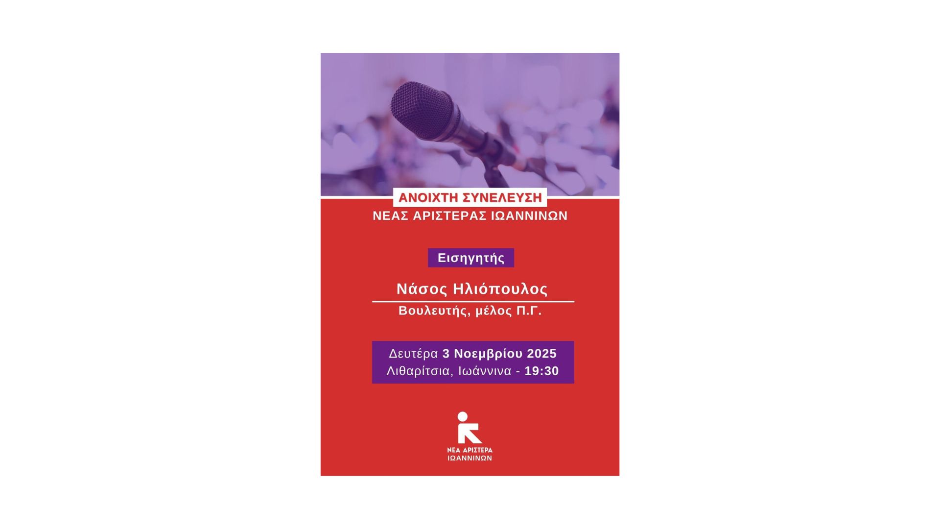 Η Νέα Αριστερά Ιωαννίνων διοργανώνει την Δευτέρα 3 Νοεμβρίου στις 19.30 στα Λιθαρίτσια, Ανοιχτή Συνέλευση- Πολιτική εκδήλωση.