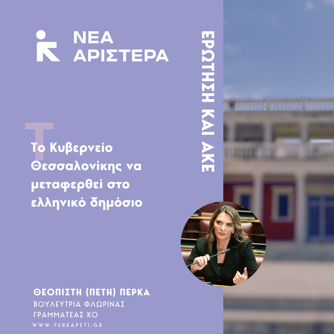 Ερωτήματα σχετικά με την απόδοση του «Κυβερνείου» στη Θεσσαλονίκης ως δημόσιο χώρο θέτουν πέντε (5) Βουλευτές της Νέας Αριστεράς, με ερώτηση και αίτηση κατάθεσης εγγράφων που κατέθεσαν με πρωτοβουλία της Βουλεύτριας Φλώρινας και Γραμματέα της Κοινοβουλευτικής Ομάδας, Πέτης Πέρκα.