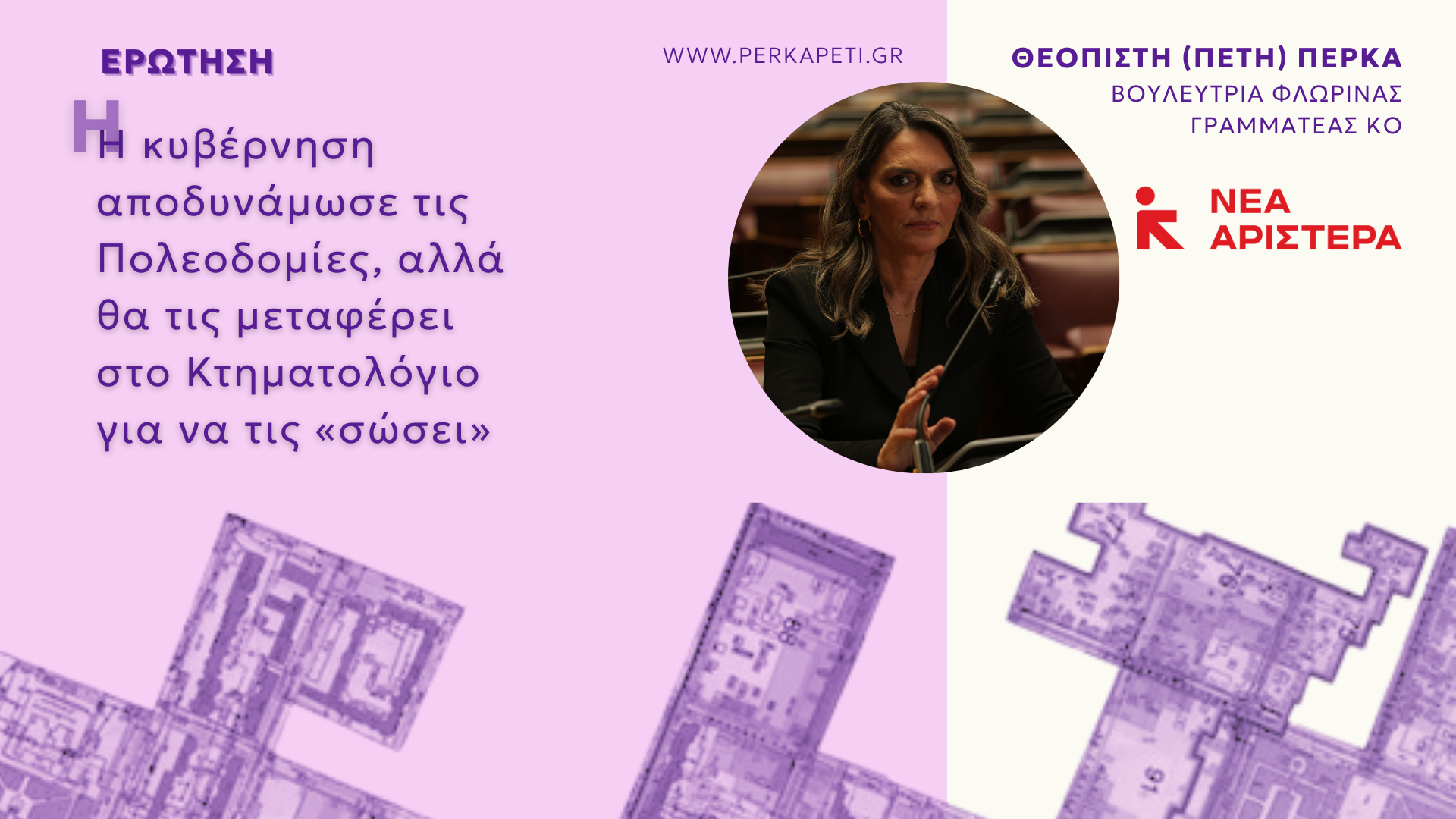 Την απόφαση της κυβέρνησης να μεταφέρει τις Πολεοδομίες (Υπηρεσίες Δόμησης – ΥΔΟΜ) από τους Δήμους στο Κτηματολόγιο, με σκοπό να αντιμετωπιστούν οι δυσλειτουργίες τους και τα φαινόμενα διαφθοράς, αναδεικνύουν με ερώτησή τους προς τον Υπουργό Περιβάλλοντος & Ενέργειας 10 Βουλευτές της Νέας Αριστεράς, έπειτα από πρωτοβουλία της Βουλεύτριας Φλώρινας και Γραμματέα της Κ.Ο., Πέτης Πέρκα.
