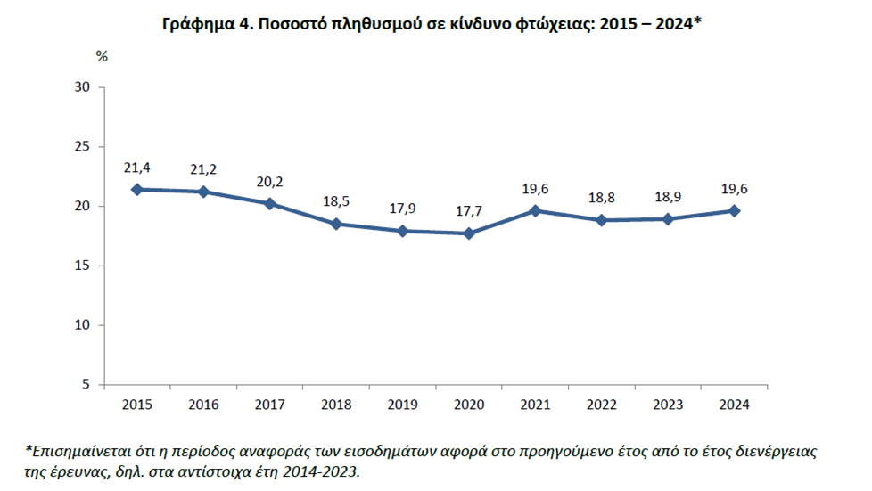 Αυτό βεβαίως αντιβαίνει τα τελευταία επίσημα στατιστικά στοιχεία της ΕΛΣΤΑΤ σύμφωνα με τα οποία η φτώχεια αυξήθηκε επί ΝΔ όπως φαίνεται και από το παρακάτω διάγραμμα της ΕΛΣΤΑΤ σύμφωνα με το οποίο η φτώχεια με βάση τα εισοδήματα του 2019 ήταν στο 17,7% των πολιτών ενώ με βάση τα εισοδήματα του 2023 είχε αυξηθεί στο 19,6%.